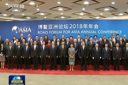 4月10日,博鰲亞洲論壇2018年年會開幕式召開前,習近平主席同謝國民資深董事長等香港、澳門和僑界代表集體合影。