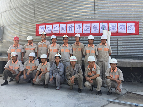 中午12點整,有限空間作業人員在蘭州市皋蘭飼料廠7#原料筒倉處集合,倉儲主任講解了有限空間作業的注意事項,要求嚴格按照密閉及有限空間作業現場安全工作流程操作,并對應急救護組員進行培訓。