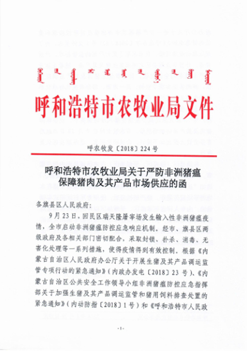 9月28日,內蒙古呼和浩特市農牧業局發布關于《呼和浩特市農牧業局關于嚴防非洲豬瘟,保障豬肉及其產品市場供應的函》,函內明確表示允許正大養豬場生豬經本地屠宰場規范屠宰,經嚴格檢疫后,由專人押送到除疫區、受威脅區以外的市內各銷售點和農貿市場銷售。此舉將有效緩解市場上豬肉及其產品供應緊張,甚至出現空檔的窘迫局面!