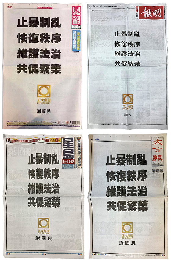 8月27日、8月29日,正大集團資深董事長謝國民先生分別在香港《東方日報》《明報》《星島日報》《大公報》等新聞媒體上頭條整版發出了“止暴制亂 恢復秩序 維護法治 共促繁榮 正大集團謝國民”的巨幅倡議,表明了一位知名海外華商華人對香港示威和暴力活動的鮮明態度。