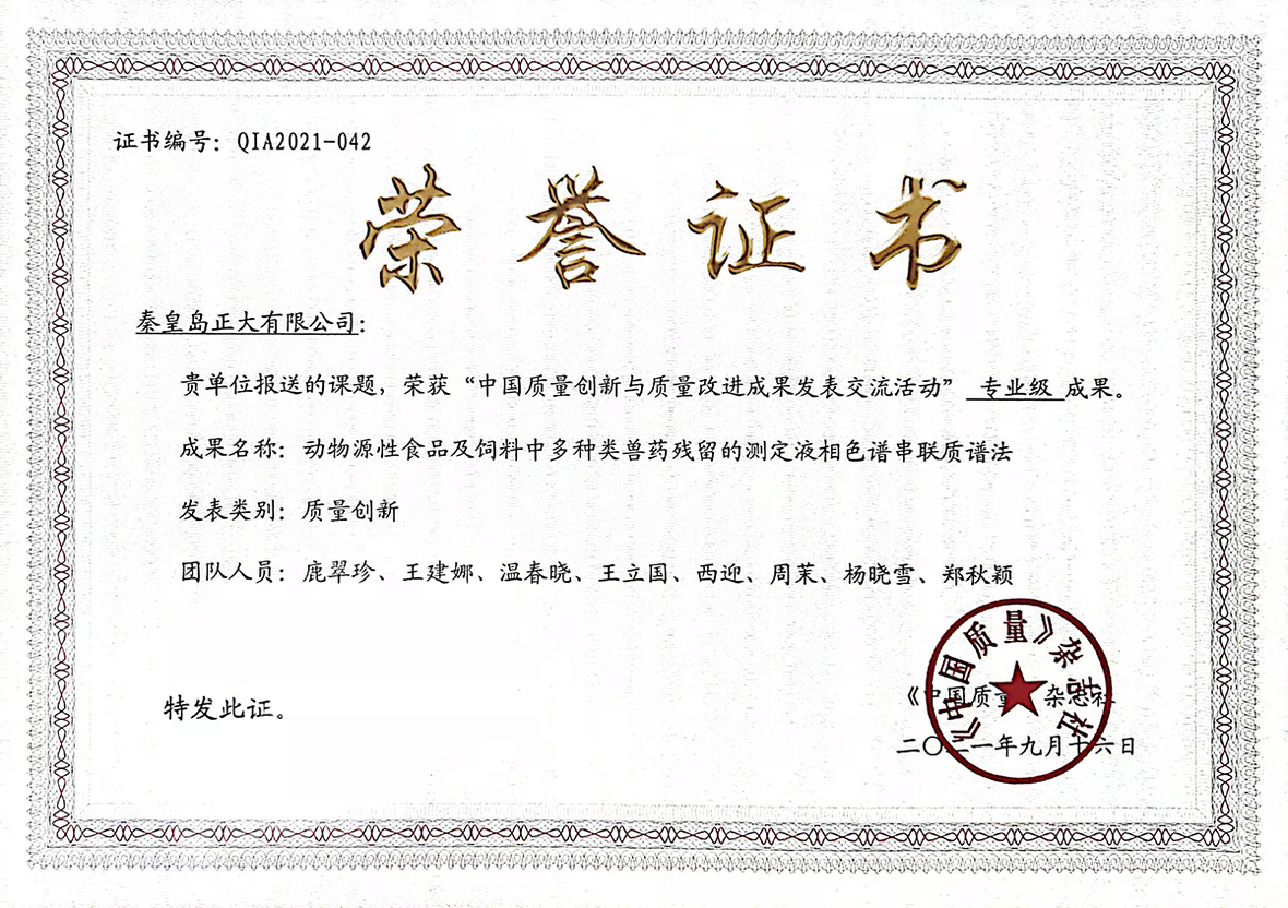 9月6日,在中國質量協會《中國質量》雜志社舉辦的2021年度“中國質量創新與質量改進成果發表交流活動”中,食品事業段佩財SVC區秦皇島正大有限公司食品安全部化驗室報送的《動物源性食品及飼料中多種類獸藥殘留量的測定液相色譜-串聯質譜法》項目榮獲質量創新組(國家二等獎)專業級成果。