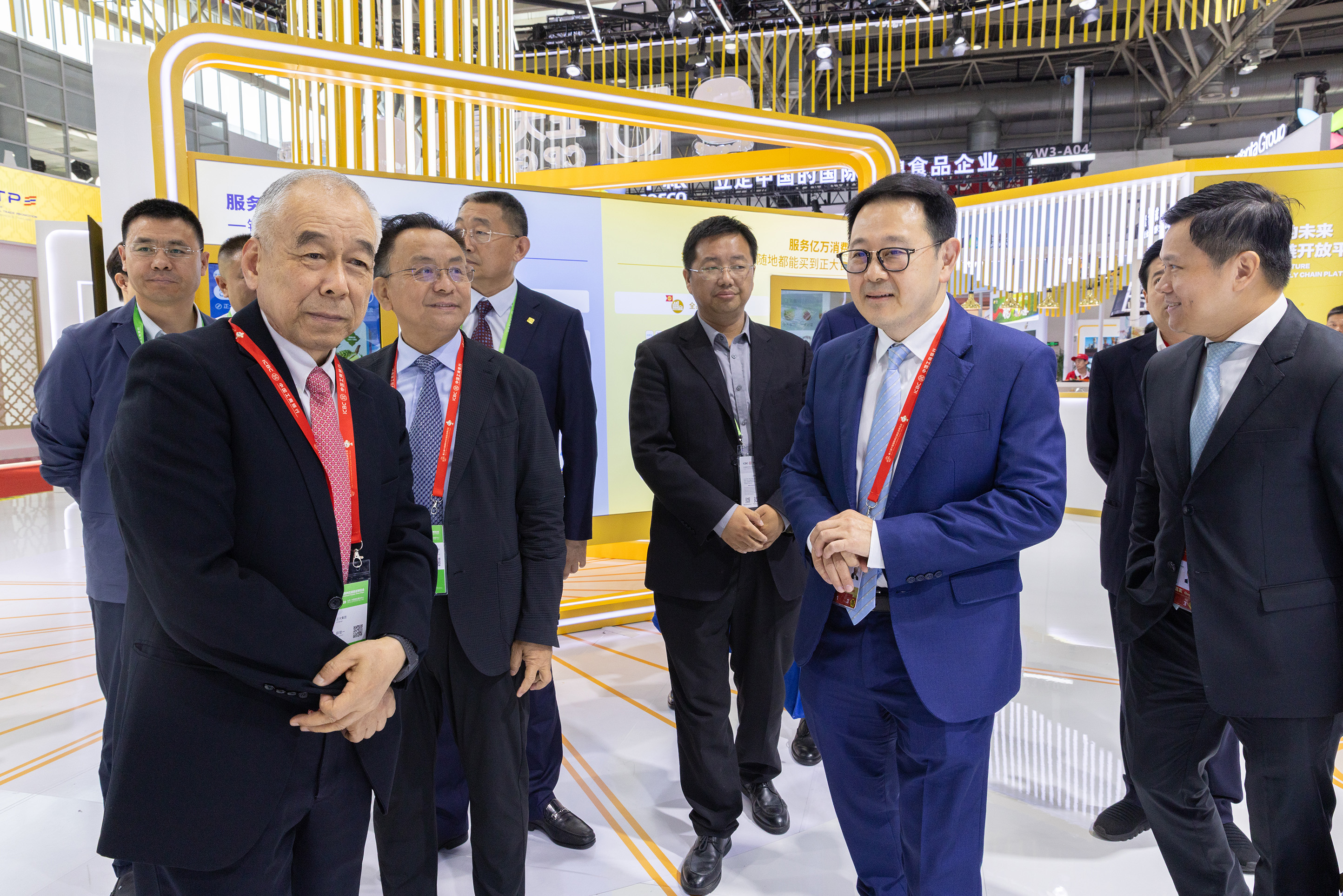 中國貿促會會長任鴻斌(中)、副會長陳建安(右一)一行參觀正大展館,正大集團農牧食品企業中國區市場中心市場活動總監楊帆(左一)熱情接待來賓。任鴻斌會長高度評價正大展館,他表示,正大集團本屆參展效果突出,生態樹設計深度契合鏈博會主題。考察正大內蒙古百萬頭生豬養殖項目展區時,他還特別稱贊:“正大全產業鏈食材品質卓越。”