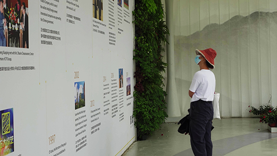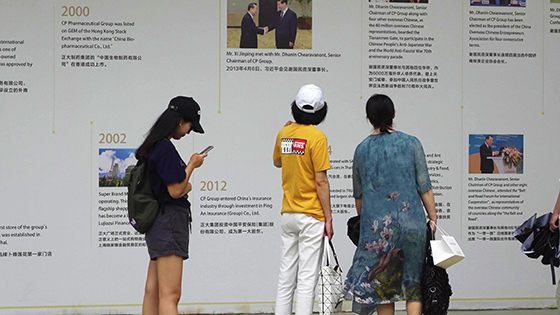 游客駐足觀看正大文化展示區的發展大事記。
