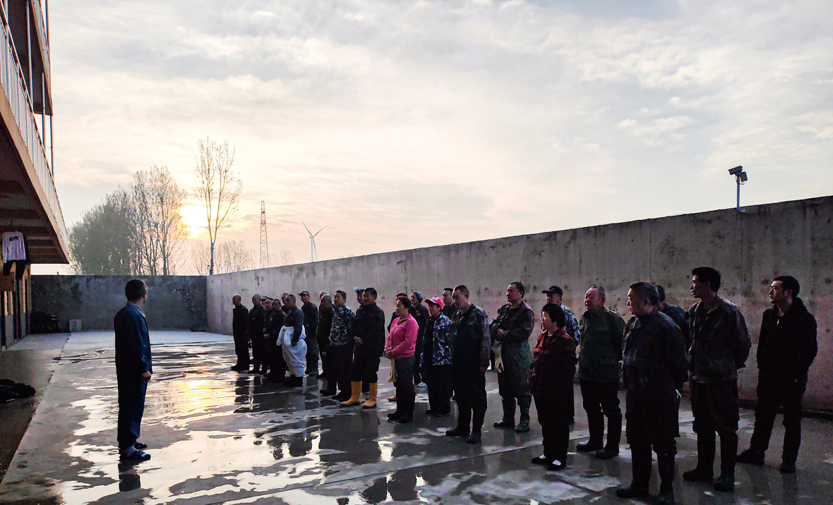 持續5個多月的洗消過程中,需要“上天”沖洗料塔料線,“入地”鉆糞坑來噴淋沖洗消毒;籌謀規劃31位工人每日工作量,保證工作質量和飽和度;教學相長,檢查糾偏,員工與領隊培訓成長;上令下達,溝通協調,使全部洗消人員達到工作作風軍事化,生活管理人性化。