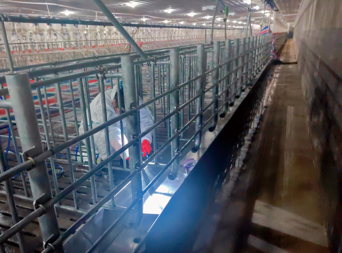 正值寒冬季節,因為忍受不了工作時潮濕、陰冷的環境和洗消的辛苦,客戶場內專職負責拔牙洗消的人員離職。在洗消組入場時,就面臨著無人可用的狀況。面臨著豬場的生產壓力和病毒隨時擴散的風險,范鵬程迅速分析了現場情況,果斷做出決定,向公司領導申請資源支持,制定了精細化洗消方案,并帶領隊伍進行陽性欄位洗消。