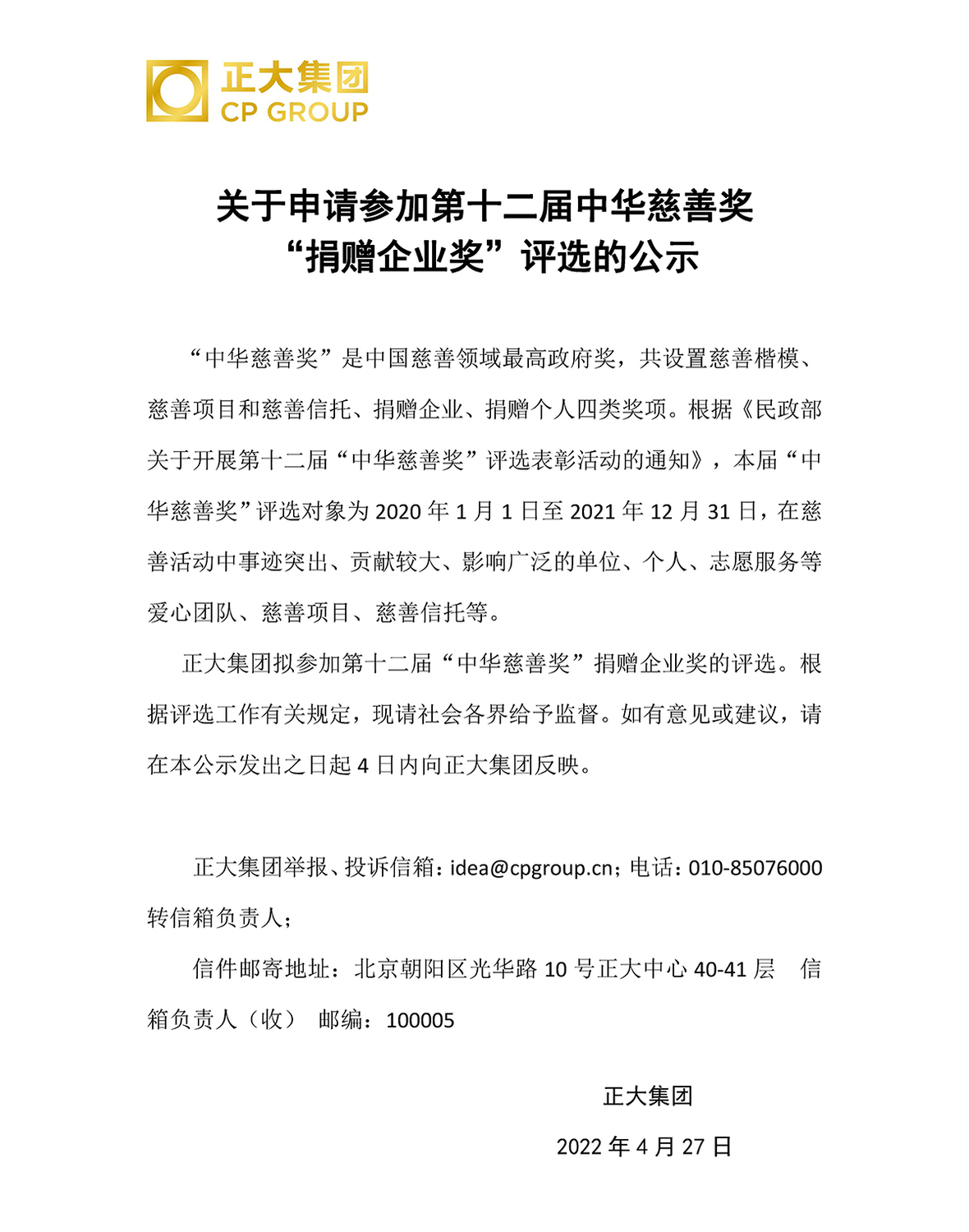 關于申請參加第十二屆中華慈善獎“捐贈企業獎”評選的公示