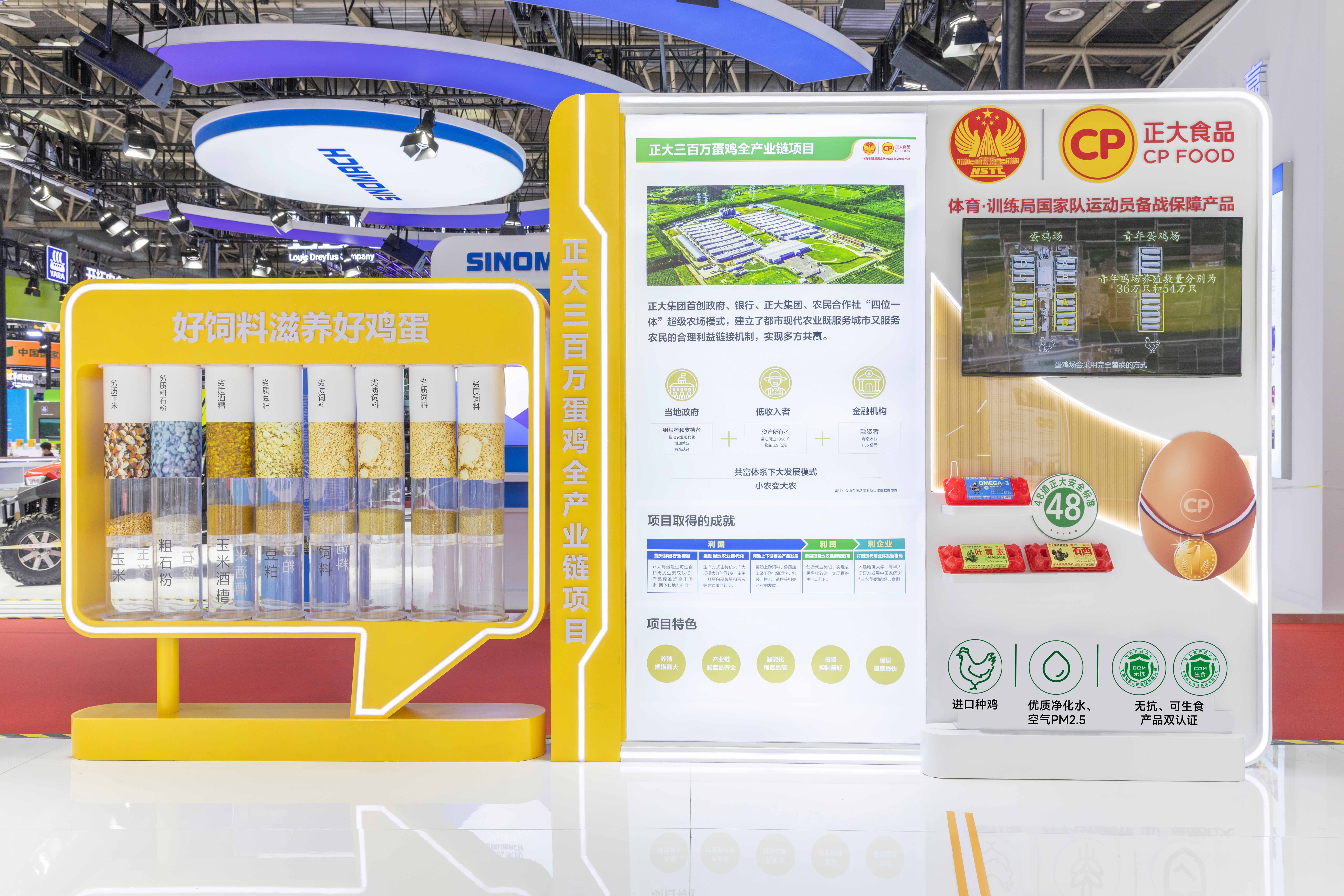 正大300萬蛋雞全產業鏈項目是集團“四位一體”模式的典范。政府整合資源、銀行提供資金支持、農民以土地入股獲得租金分紅與就業崗位、企業負責現代化運營管理,該模式成功重塑農業生產關系,實現“小農變大農”的共同富裕目標。現場還陳列了通過喂養OMEGA-3、葉黃素、富硒等功能性飼料生產的特色營養雞蛋,并利用VR技術播放雞蛋科普視頻,讓來訪嘉賓沉浸式學習雞蛋知識。