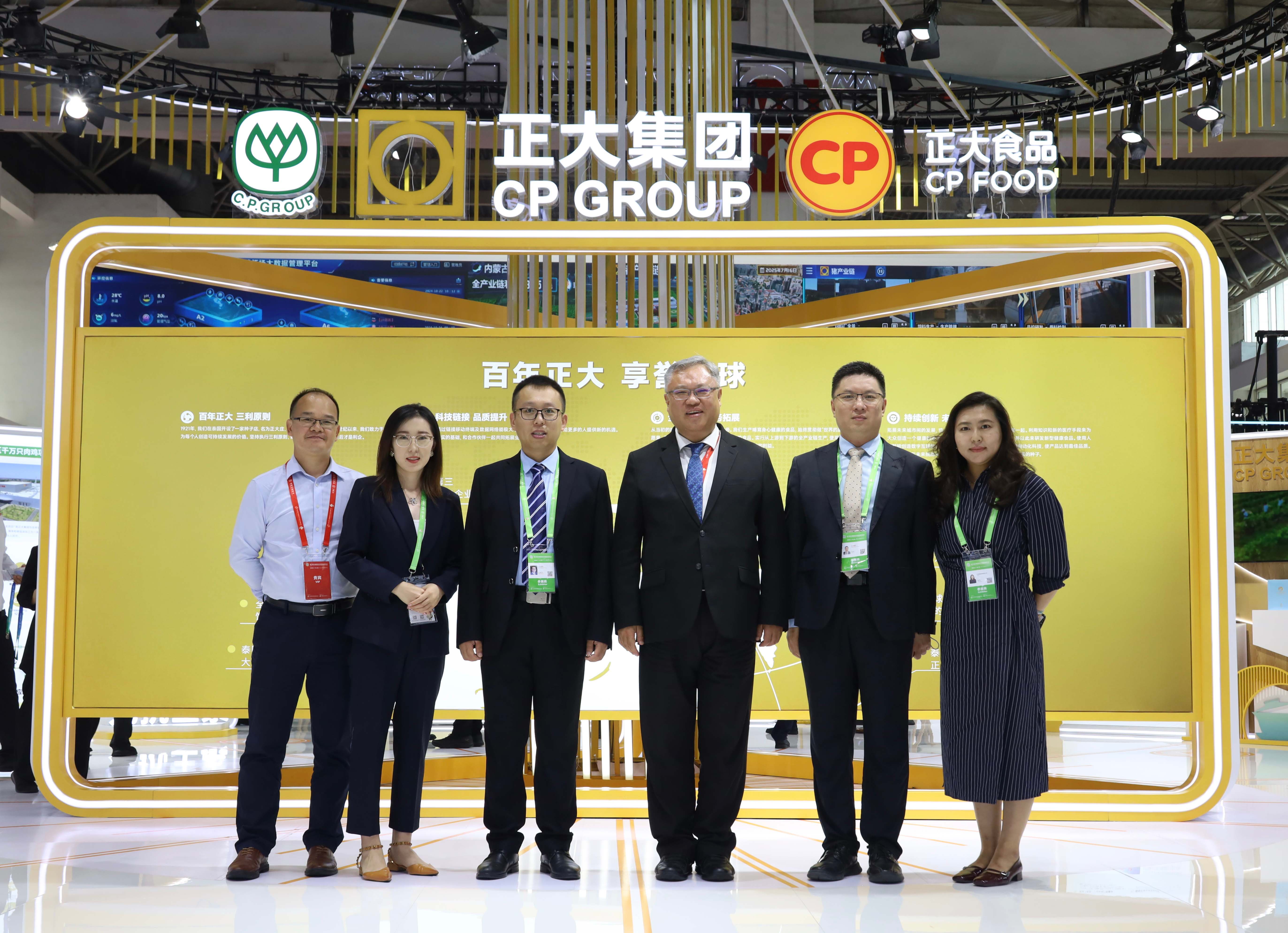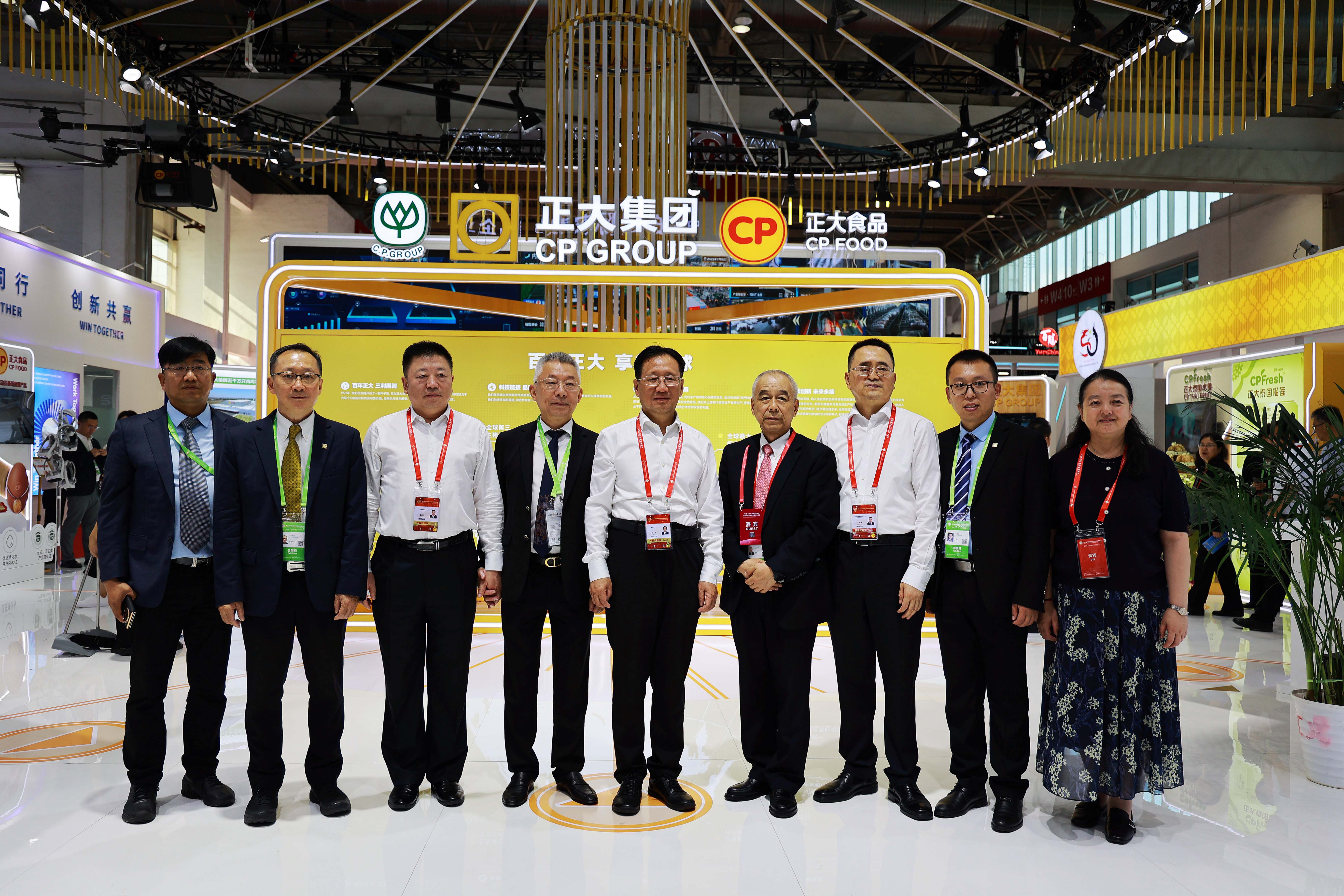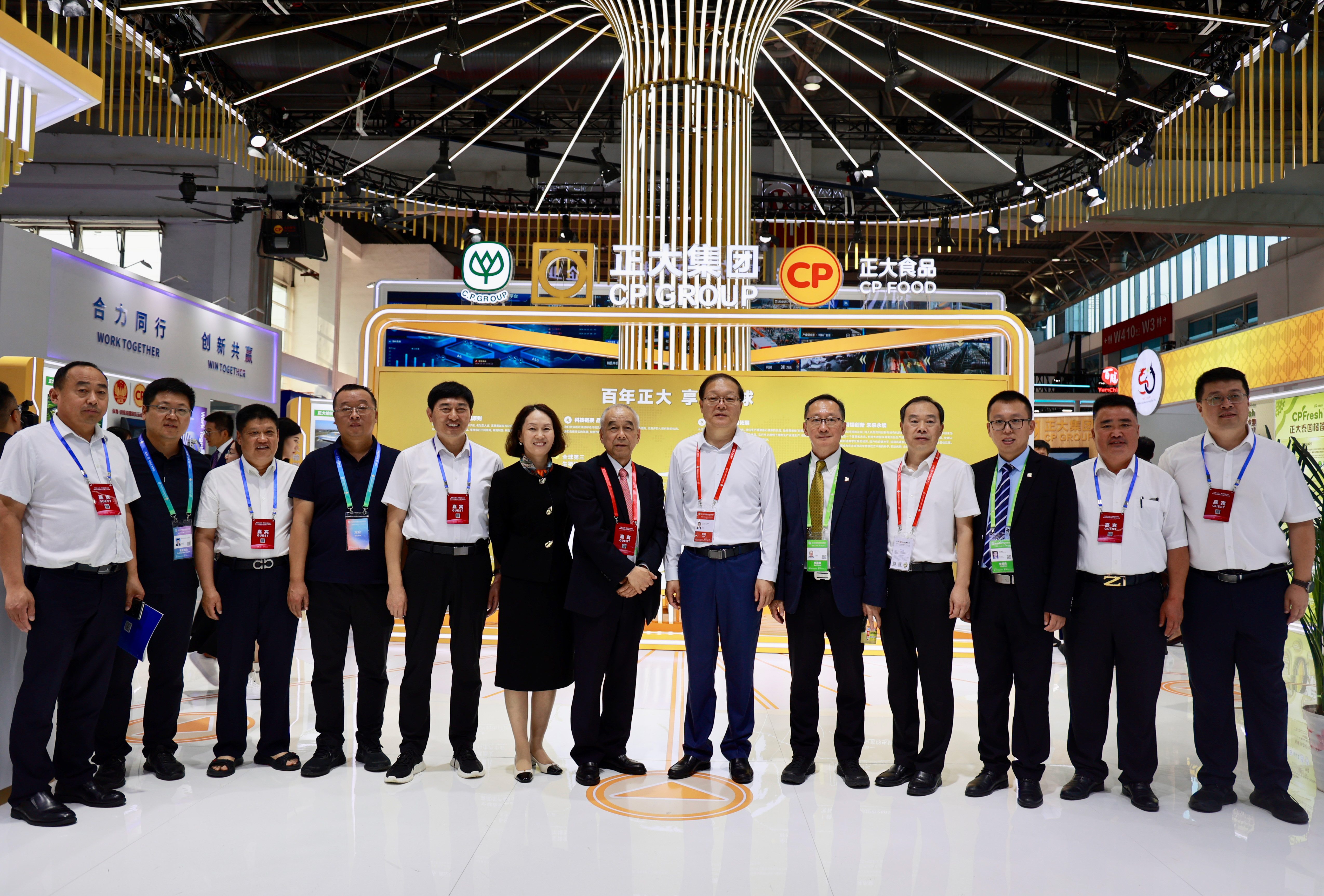 中國貿促會會長任鴻斌(中)、副會長陳建安(右一)一行參觀正大展館,正大集團農牧食品企業中國區市場中心市場活動總監楊帆(左一)熱情接待來賓。任鴻斌會長高度評價正大展館,他表示,正大集團本屆參展效果突出,生態樹設計深度契合鏈博會主題。考察正大內蒙古百萬頭生豬養殖項目展區時,他還特別稱贊:“正大全產業鏈食材品質卓越。”