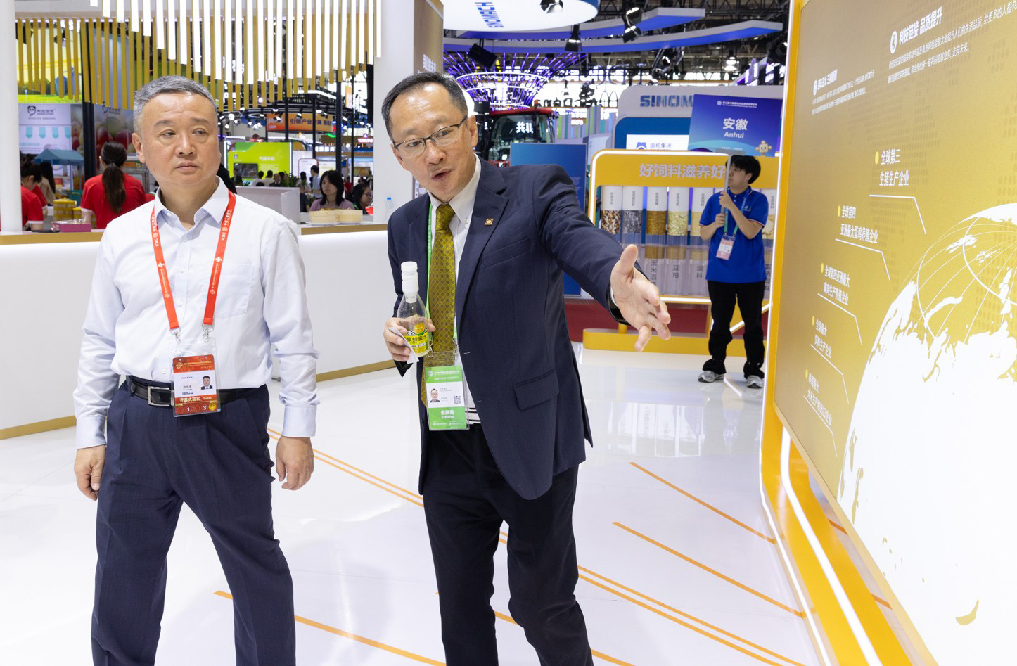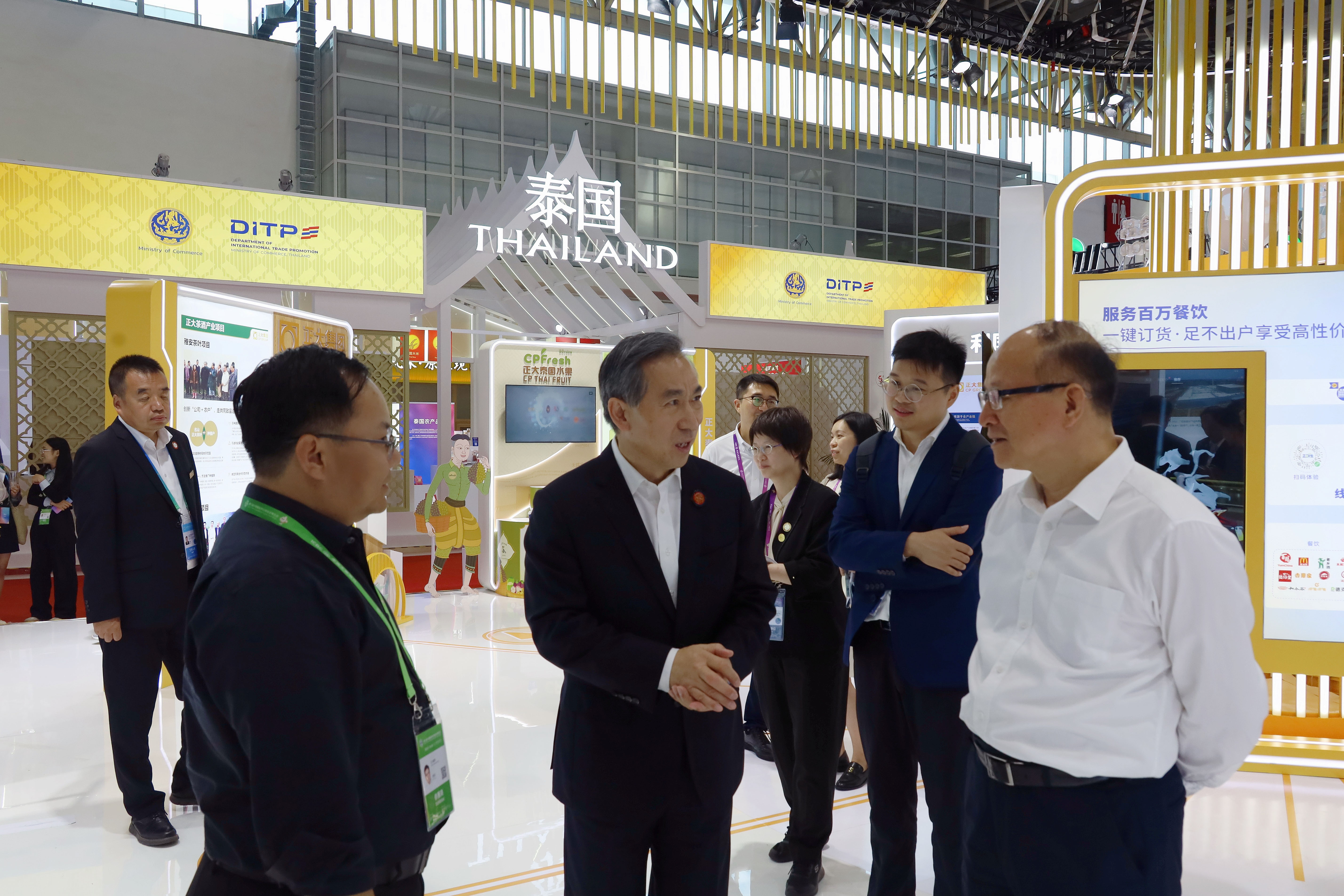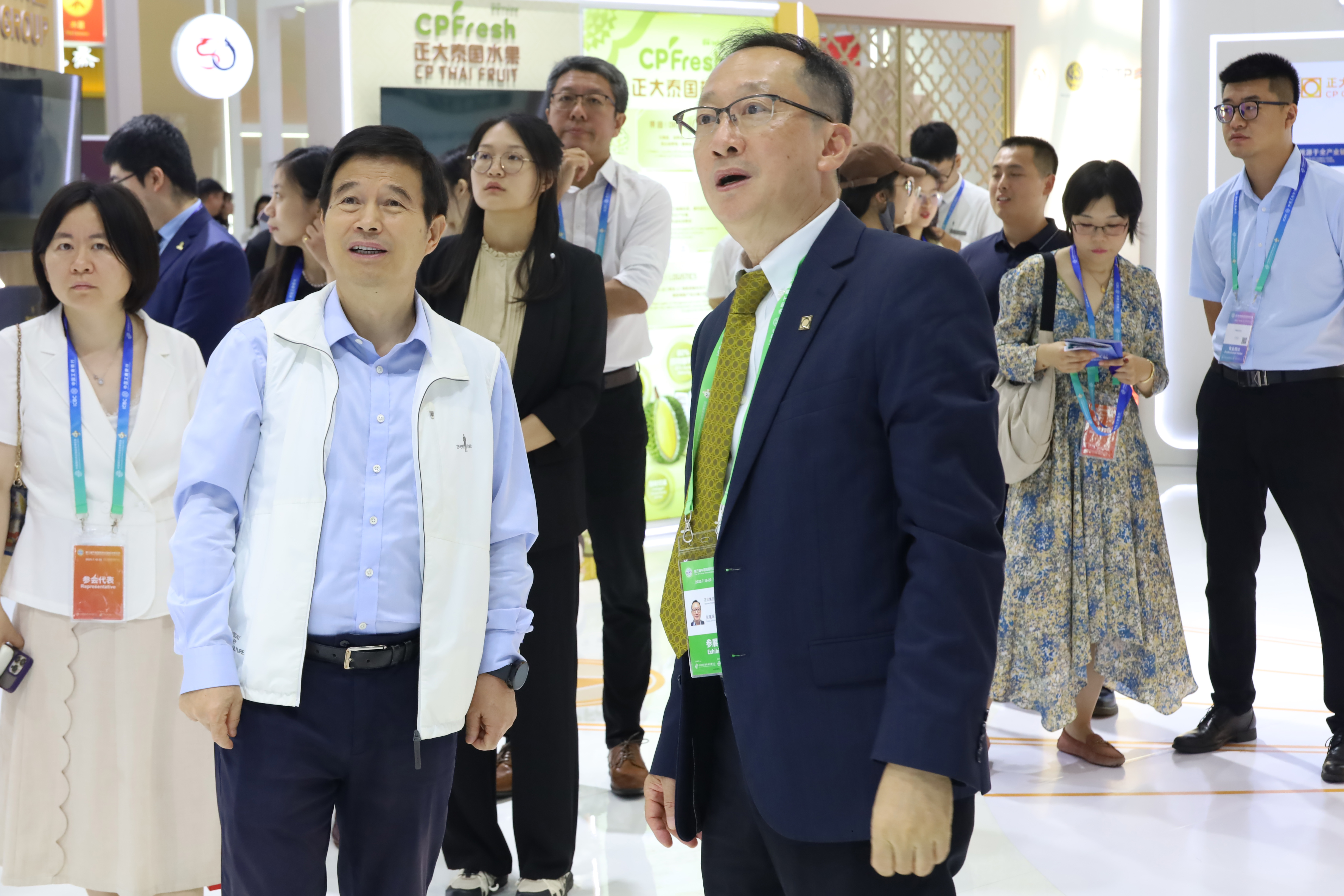 中國貿促會會長任鴻斌(中)、副會長陳建安(右一)一行參觀正大展館,正大集團農牧食品企業中國區市場中心市場活動總監楊帆(左一)熱情接待來賓。任鴻斌會長高度評價正大展館,他表示,正大集團本屆參展效果突出,生態樹設計深度契合鏈博會主題。考察正大內蒙古百萬頭生豬養殖項目展區時,他還特別稱贊:“正大全產業鏈食材品質卓越。”