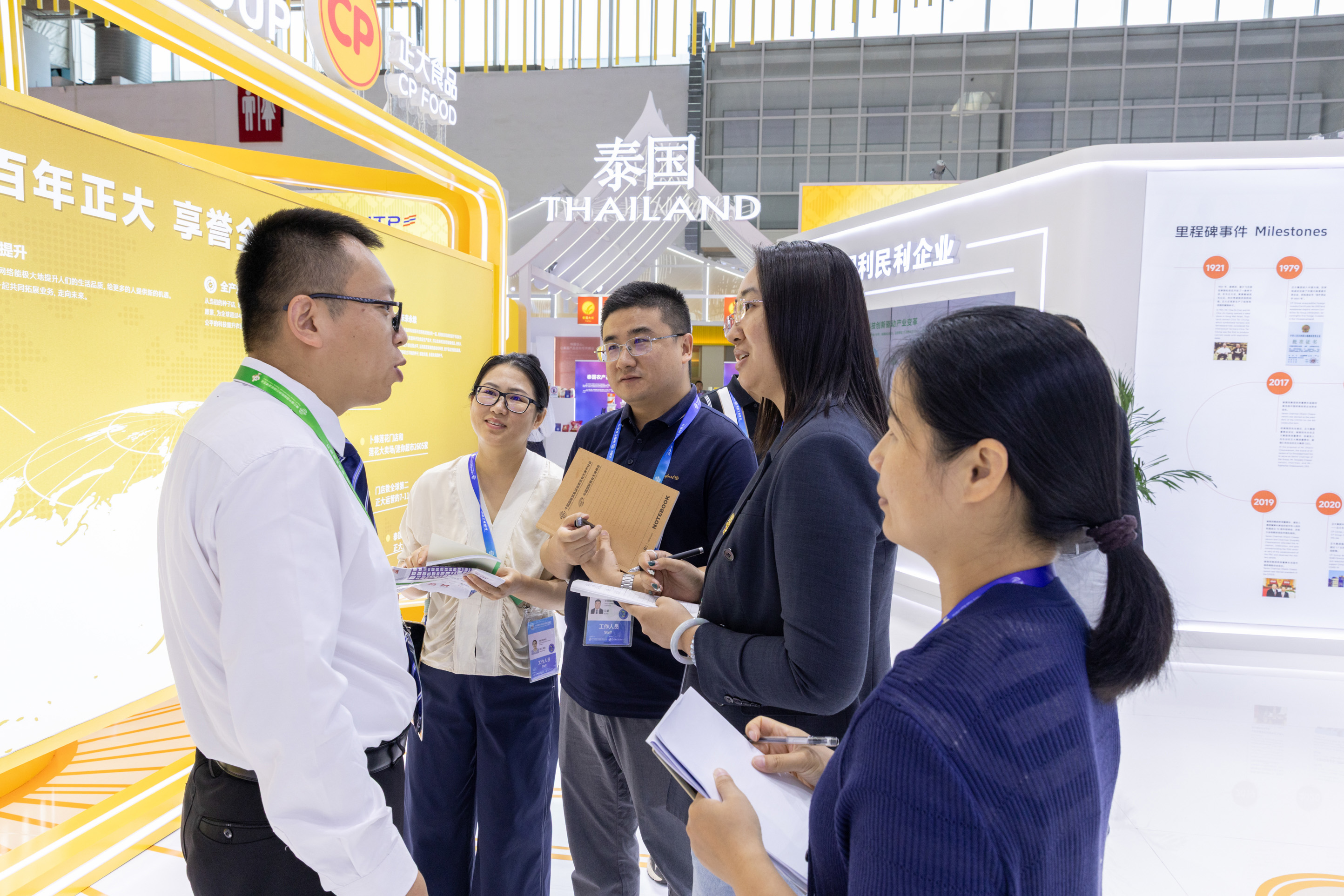 商務部歐亞司一行參觀正大展館,正大集團農牧食品企業中國區市場中心品牌傳播總監郭悅楊(右)熱情接待來賓。